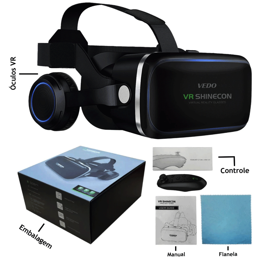 Itens Inclusos: 1x Headset VR, 1x Controle Remoto, 1x Manual do Usuário, 1x Flanela para Limpeza das Lentes